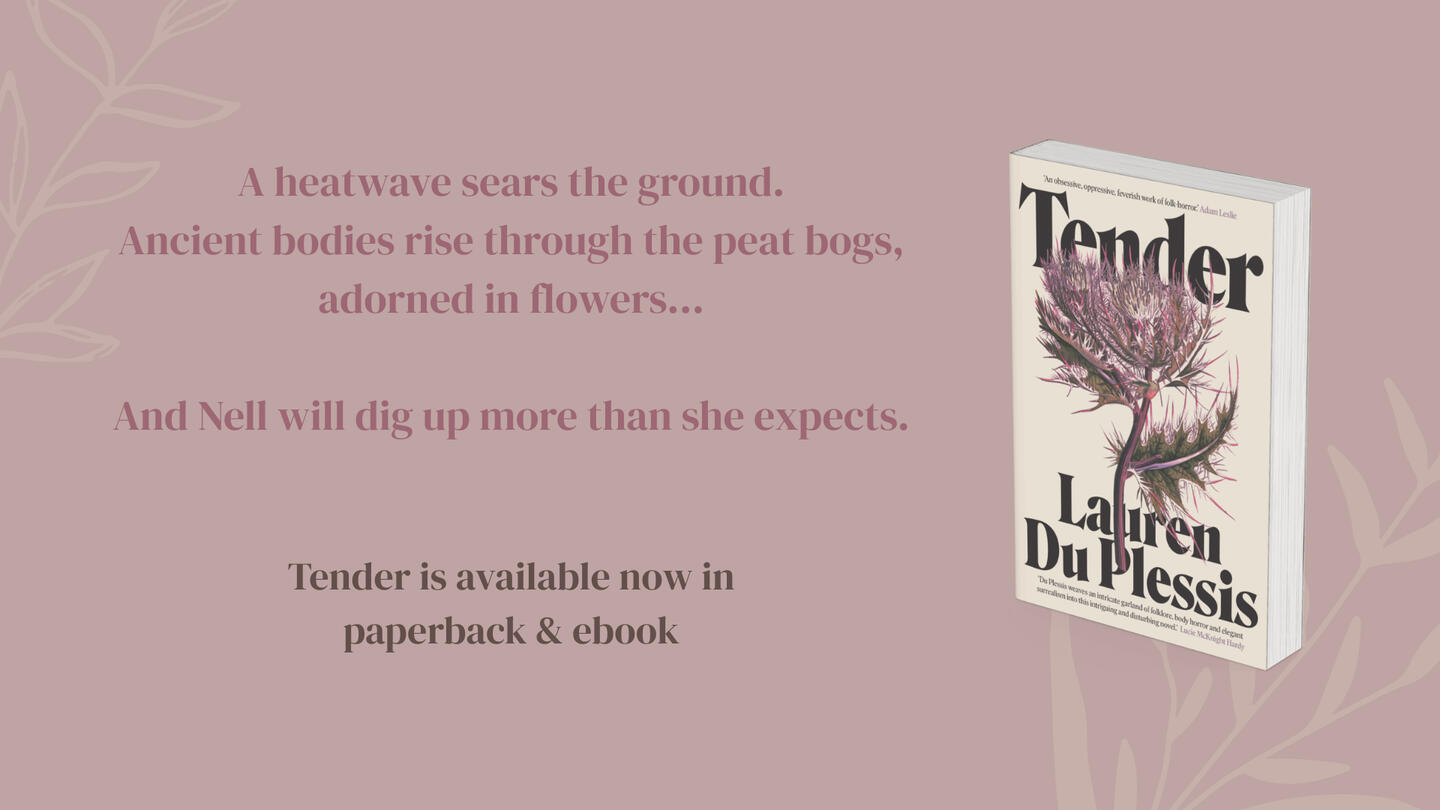 My debut novel, released September 2025 from Influx PressNell has curated a perfect museum of the self: a successful career in archaeobotany, a pastel Instagram filled with flowers, and an uncompromising manicure routine. She’s convinced that her veneer of perfection will mask the parts of her she’d rather not think about.When two ‘bog bodies’ are discovered in elaborate floral graves in a Somerset fen, Nell seizes the opportunity to excavate their secrets. But the deeper she digs into the fertile, waterlogged earth, the more she uncovers memories of her unsettled childhood and strained relationship with her sister… and the more her body manifests her own wildness in ways she can’t ignore.Under the pressure of a blazing summer, Nell whirlwinds into toxic romance, intense friendships, and the brutal process of reconciling her past and her future before the weight of it all buries her, too.Blending folkloric horror with explorations of womanhood against a backdrop of eco-anxiety, Tender burrows into the quiet violence of overcoming and accepting our darkest sides.
